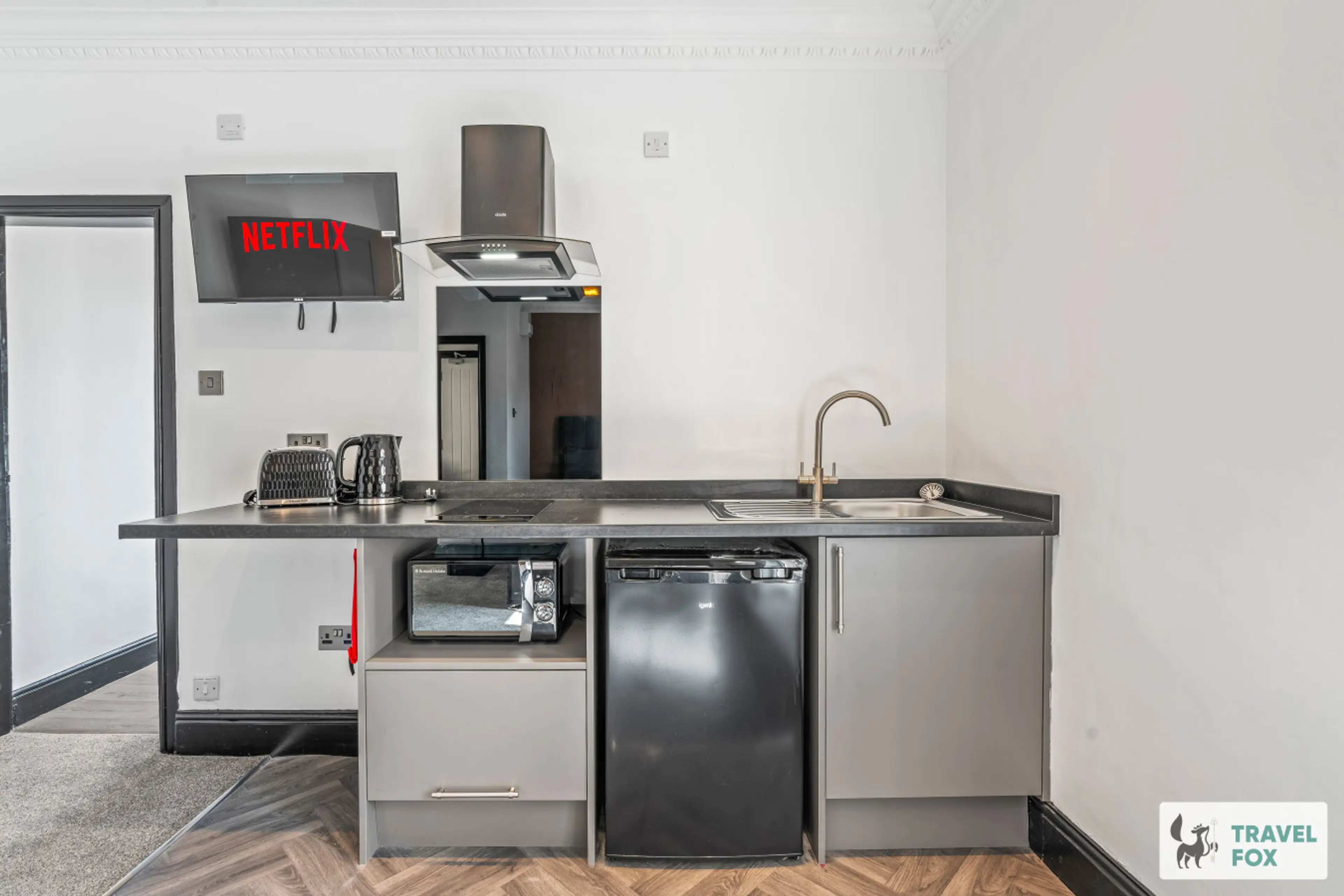Enjoy your stay at this 1 bed flat, located just steps away from the beach! This flat has a small kitchen and ensuite bathroom. While this flat is perfect for solo travellers or couples, this building has multiple flats available and therefore can accommodate larger groups as well.